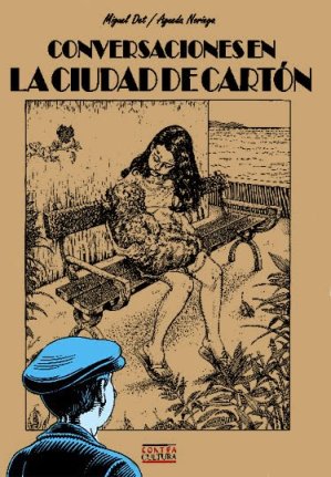 Conversaciones en la Ciudad de Cartón es una biografía de Martín Adán novelada en forma gráfica. Las páginas iniciales nos lo muestran anciano, enfermo y esperando la llegada de la muerte como purificación y acto de libertad final. Luego la historia se dispersa en un transcurrir de voces que se reparten en distintos pasajes y momentos. Entre otros se entremezclan los diálogos de Martín Adán con José Carlos Mariátegui, con Ramón, el hermano fallecido y alter ego del poeta, y con los jóvenes a quienes se confiesa entre bebidas. La línea que vincula estos intercambios es el devenir del personaje central pero también la capacidad de la palabra para gestar un entretejido de reflexiones y cuestionamientos, el cual termina incluso por interpelar al lector y los sucesos más recientes. No por gusto se dedica una página a contrastar la cuidada apariencia de ciertos políticos con sus actos de corrupción y sus endebles discursos. (p. 57) La apuesta es por una permanente construcción de significados.