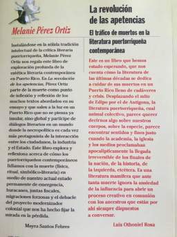 Partiendo de un estudio lacaniano, La revolución de las apetencias: el tráfico de muertos en la literatura puertorriqueña contemporánea analiza esta gran cantidad de escritores y textos puertorriqueños; el enfoque primordial de la autora está en aquellos de la generación del setenta y más a fondo de aquellos contemporáneos, y que se encuentran en lo que la autora denomina la generación inquieta. Sí, Pérez Ortiz nos habla de la muerte y los muertos, de los muertos en los textos literarios, de quienes los escriben y de quienes influyen en ellos. Hablar de los muertos –de nuestros muertos—es imperativo sobre todo para hablar de la supervivencia y la fuerza colectiva, necesarias para forjar algo que nos una, ya sea rechazando al estado, a ese sistema neoliberal que intenta devorarnos, mientras se forjan permanencias y fugas otras. Este es el interés de Pérez Ortiz: presentarnos lo que se va forjando. En los cinco capítulos de este libro, la autora nos explica y analiza la literatura puertorriqueña contemporánea a través del diálogo de éstas con otras tantas; las historias de los ancestros de quienes escriben (y que incluyen no sólo historias y ancestros insulares, sino también globales); la creación de mitos; y la memoria histórica, que sirve para crear, invocar y subrayar esa herencia simbólica que queda impregnada en nuestros cuerpos e identidades individuales y colectivas.