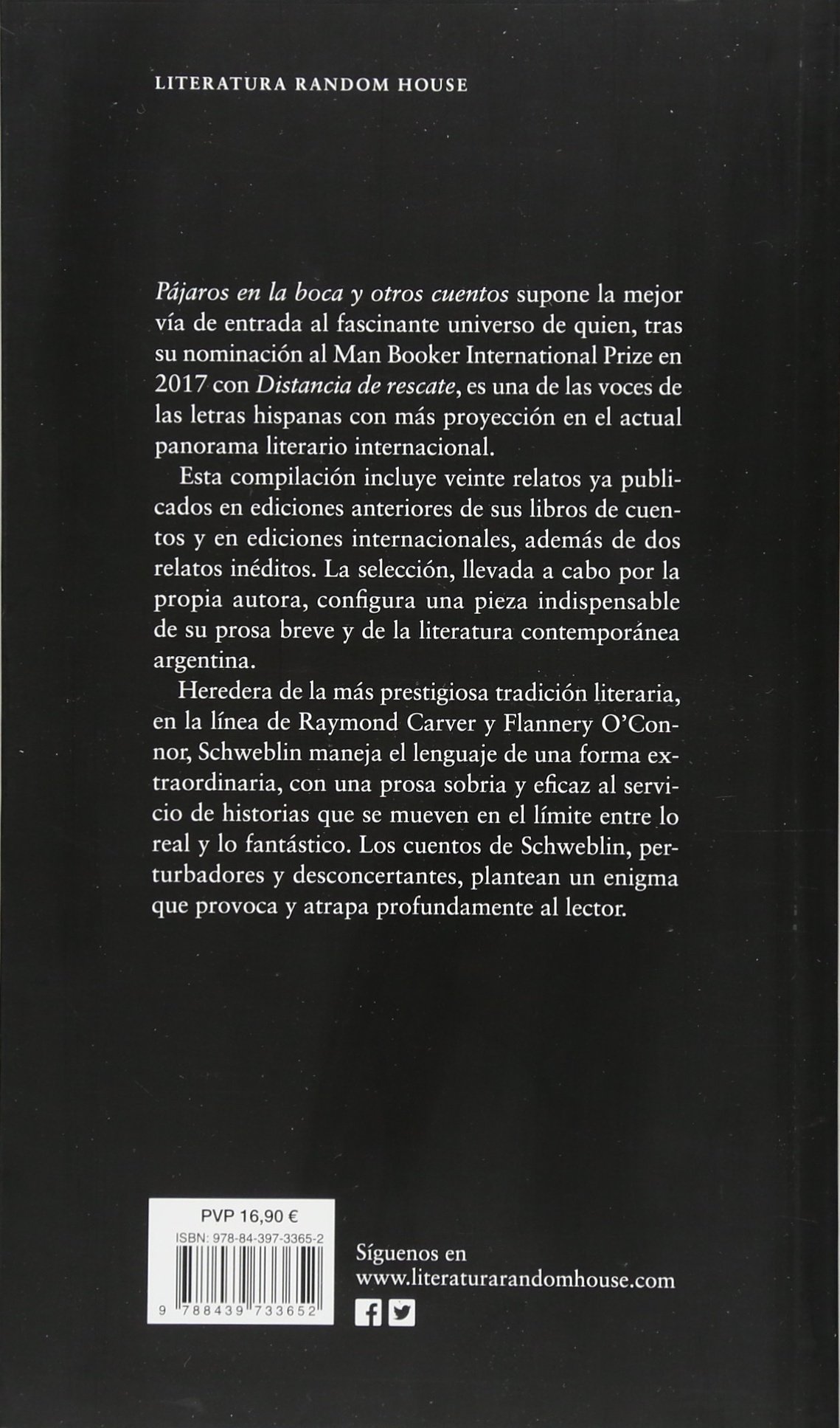 Este es un fragmento de la antología de relatos Pájaros en la boca y otros cuentos. La reciente reimpresión de 2019 toma cuentos de anteriores publicaciones, como El núcleo del disturbio (2002) o su homónimo de 2009 para ofrecer y ampliar una visión panorámica de su proyecto narrativo, en el cual Schweblin nos interroga con la conjunción de dos genealogías narrativas: la fantástica y la feminista. Ahora bien, en estas conexiones conviene distinguir un aspecto y un propósito: el aspecto, es que la autora solo deja ver pequeños destellos de historias reducidas al mínimo, en las que de su estructura desaparecen los elementos más básicos; el propósito, es acercarnos a una violencia demasiado familiar, de forma que nos atrae y nos horroriza en el descubrimiento de que no solo nos es conocida en sus manifestaciones sobre el género femenino, sino también, atractiva en cuanto que nos obliga a seguir leyendo.