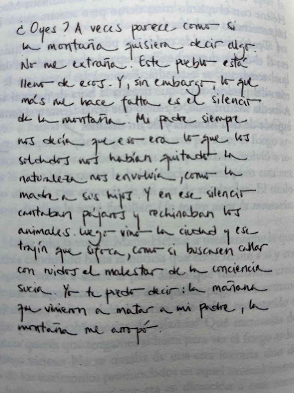 Algunos de los pasajes más bellos del libro son de los recuerdos cotidianos de los sobrevivientes de las masacres de indígenas en Guatemala durante los años 80, en particular de las comunidades de habla K’iché de Amajchel. En esta cita, un personaje indígena recuerda la resistencia de sus territorios durante la Guerra Civil, en la que, aprovechando sus conocimientos del territorio, le ponían trampas al ejército invasor: