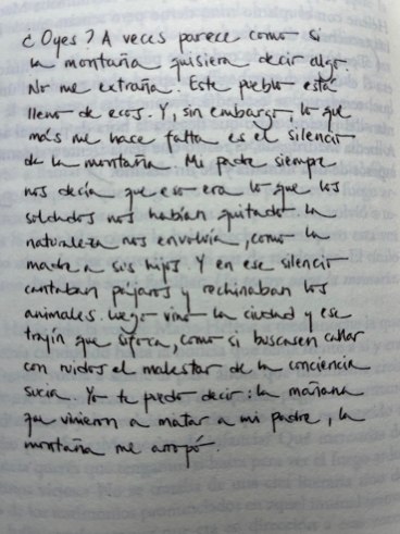 “Recordé la cara taciturna y severa de mi padre, las grietas sobre la tierra húmeda en los días de lluvia, el sonido que hacía el ocote al arder, las piernas expuestas de las mujeres que entraban al río, un par de zapatos viejos tirados sobre una esquina como una novedad traída desde lejos, amaneceres que ahora he vuelto a ver, el olor a incienso del copal, la vez que por unos minutos me perdí en plena montaña, la alegría con la que jugábamos con los cochitos, los cincos que trajo mi tío consigo de uno de sus viajes a las fincas, los mapaches que asediaban las milpas y las trampas con las que las cuidábamos, la confusión y el miedo que sentí la tarde en la que vi el primer rifle, mis padres acurrucados en la cama en posiciones que no comprendí, un par de perros comiendo olote mientras en la montaña se escuchaba el revolotear de los pájaros, las lecciones de catequismo, el placer inútil que descubrí la tarde en la que por primera vez tracé con una rama un garabato sobre la ribera del río, la punzada que sentí al adentrarme por primera vez en la capital, el rostro del tío borracho gritando, irónico en su dolor, Viva Guatemala, Viva la Patria, una ardilla colgando de una rama y la impresión de que la rama en cualquier momento se rompería…” (224).