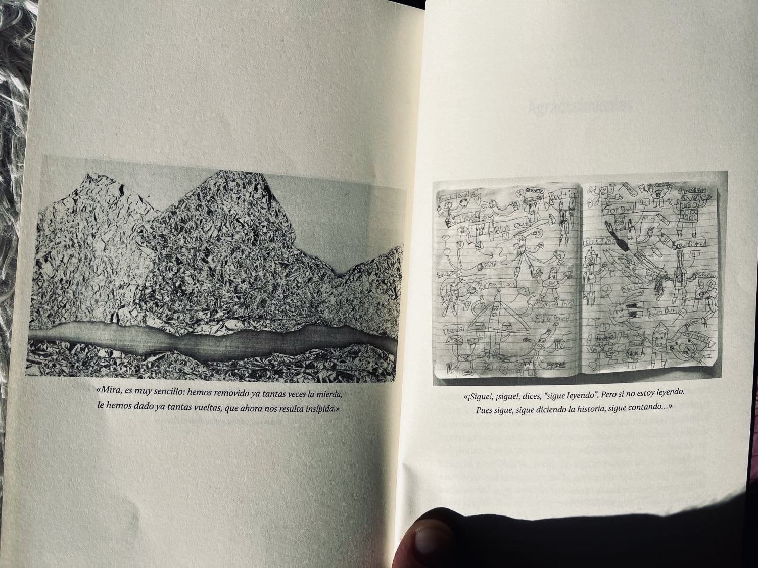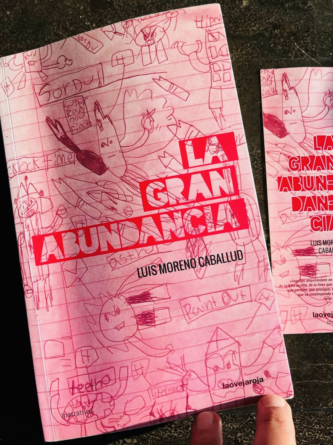 Riéndome con esta escena tan buena, de pronto me pongo a mirar el libro que tengo entre las manos. ¿Funcionaría esta novela con igual potencia si estuviera publicada por las dos grandes multinacionales que tienen un monopolio de acero sobre toda la industria del libro en español? ¿Cómo es posible que la inmensa mayoría de la literatura que consumimos en español esté completamente asimilada a la maquinaria corporativa de dos grupos editoriales comerciales? ¿Si esta novela hubiera circulado por medio de agentes literarios (¿AP’s?) que la hubieran cambiado por completo, abaratando sus contenidos, aplanando su diferencias y su dificultad, para poder “venderla” mejor a esas mismas multinacionales? ¿Hubiera tenido un arte de tapa tan hermoso con los dibujos del hijo del autor, que le dan un nuevo significado al final tan contundente de la novela? No. Valdría la pena echarle una vistazo al potente texto de presentación que escriben los de La Oveja Roja, editores de esta novela, a su maravilloso proyecto editorial, texto que termina diciendo, “Queríamos resistir y nos pusimos a crear”.