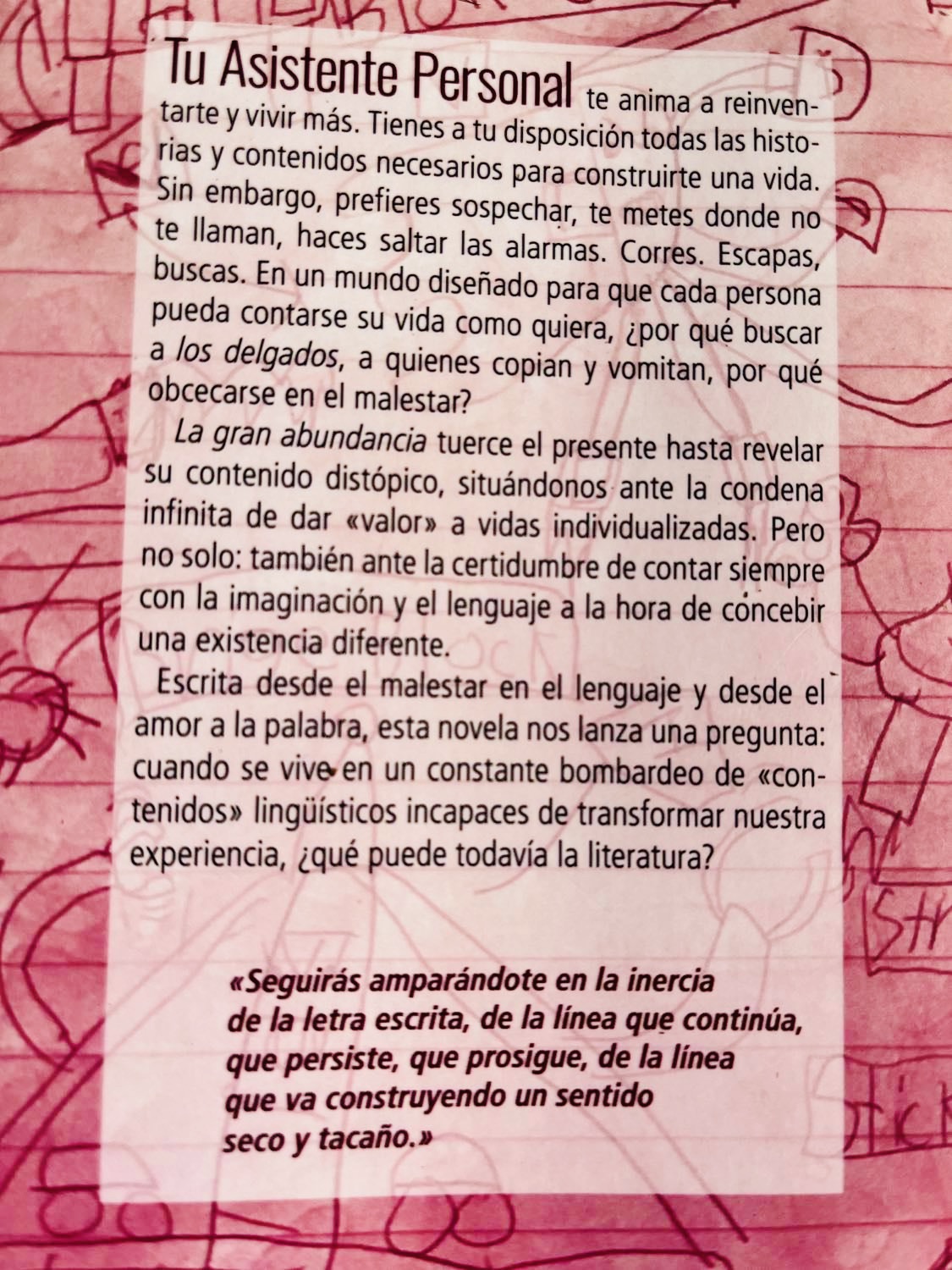 Hasta aquí nos hemos concentrado en el conflicto argumentativo de la novela. Su ejecución formal, sin embargo, nos presenta unos conflictos tremendos todavía más ricos. Y es que si el argumento busca esa salida a lo narrable, la forma de la novela es un aluvión virtuoso de relatos breves, uno tras del otro, que casi que nos fuerza a los lectores a disfrutar los relatos que venden los AP’s a sus clientes. Formalmente la novela nos fuerza a disfrutar aquello mismo que su argumento denuncia. Mientras leíamos no podíamos parar de pensar que realmente nos encantaría tener un Asistente Personal que todos los días nos trajera historias nuevas perfectamente diseñadas para nuestras necesidades emocionales. Como es una novela tan literariamente rica, escrita por un nerd de la literatura, a lo largo de 14 años intensos (y se nota), y escrita para lectores como nosotres que vivimos apasionados por la literatura dura, es inevitable ceder al deseo malvado de disfrutar la pesadilla que nos narra.