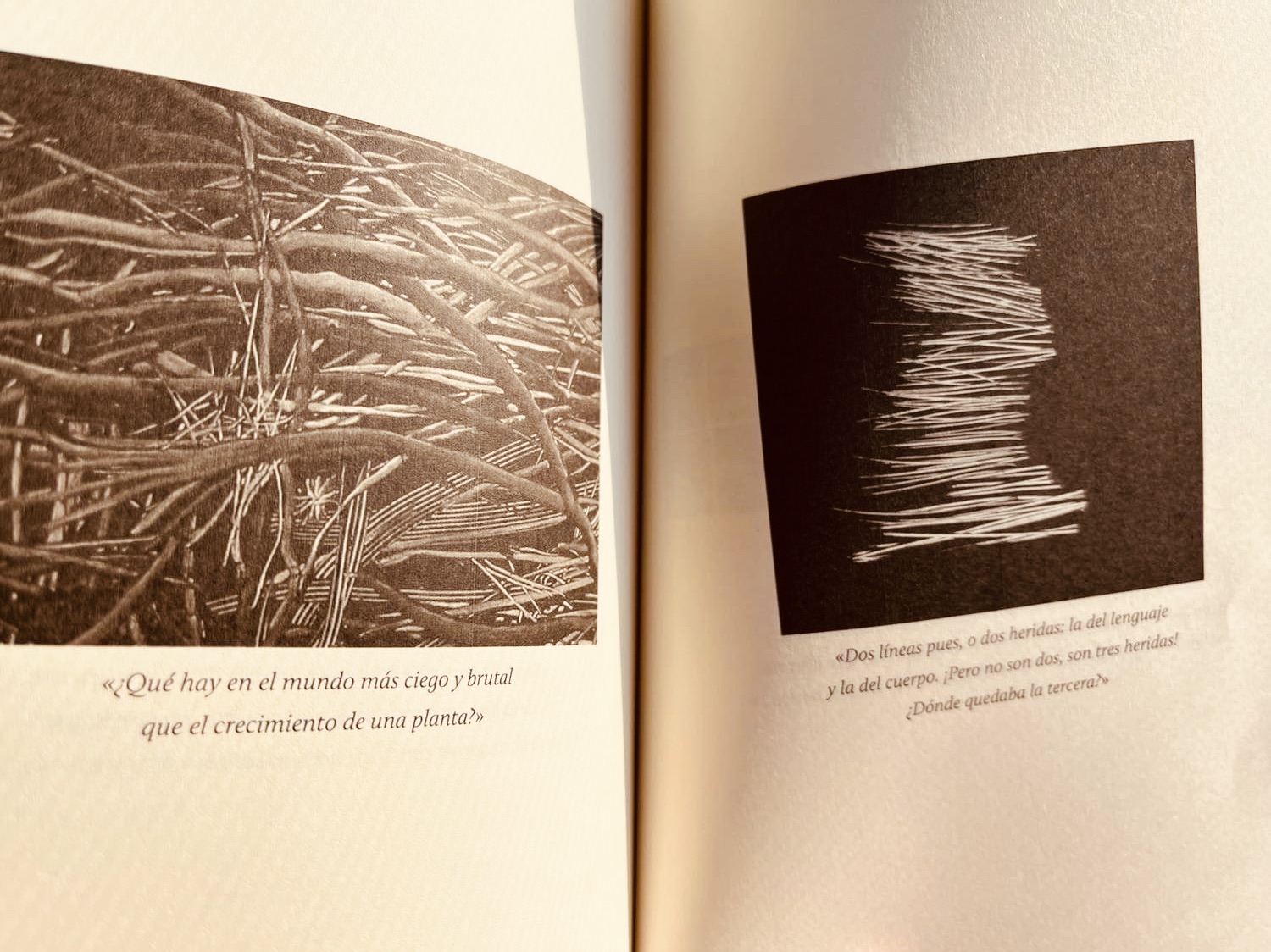 “Bamboleándose a izquierda y derecha, muy lentamente, la hoja fue cayendo como un atisbo otoñal en pleno verano. Fue cayendo inexorablemente y con la inclinación, con el clinamen necesario para que el mundo sea mundo, pues no se hace un mundo sólo con átomos cayendo en el vacío en línea recta, es necesario que estos se inclinen y choquen unos con otros” (63).