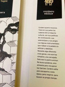 “Cordero quiere moverse. Tiene en sus patas las cadenas de la máquina cultural, con sus políticas de victimización, sus estereotipos, sus jergas. Las lógicas instrumentales que rodean a la palabra lo asfixian y debilitan. Necesita algo diferente: unas ganas, una sonrisa cómplice, una carcajada. Solo eso lo podría animar. No busca palabras, sino alimento para recuperar las fuerzas. Cordero edita para escaparle a esta época, para respirar, para buscar su propio tiempo”.