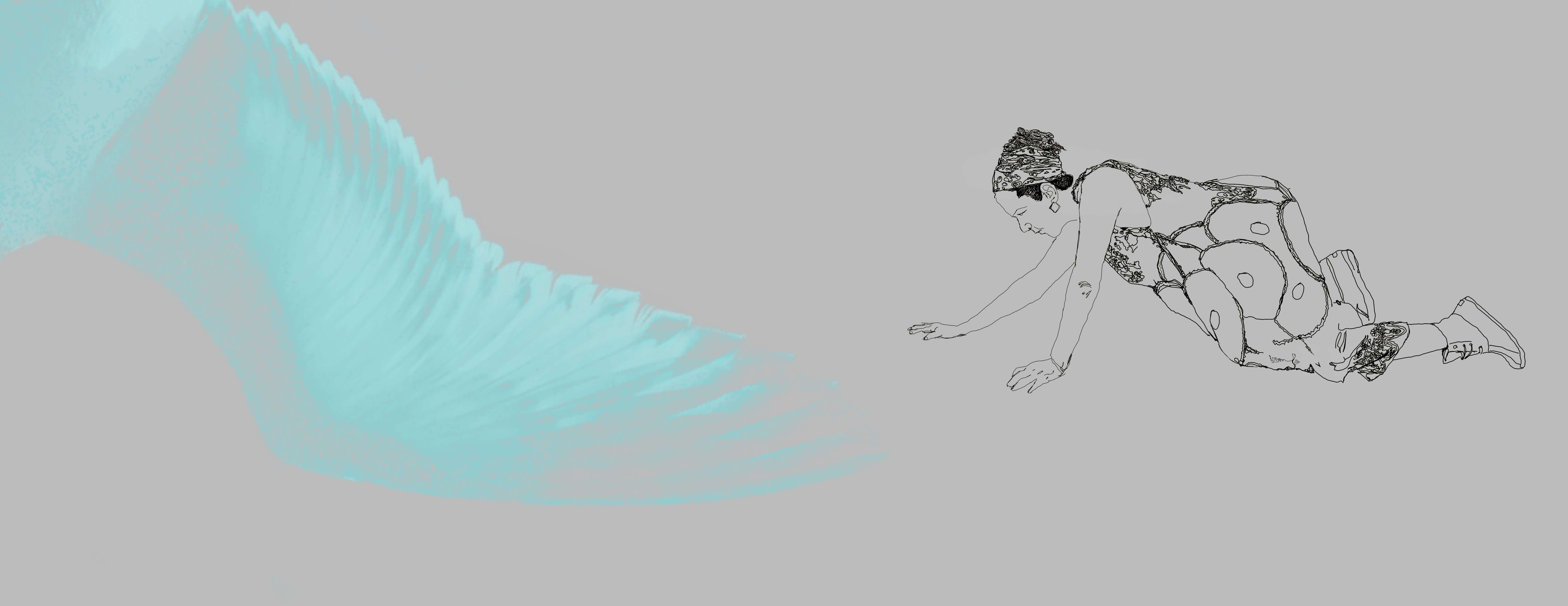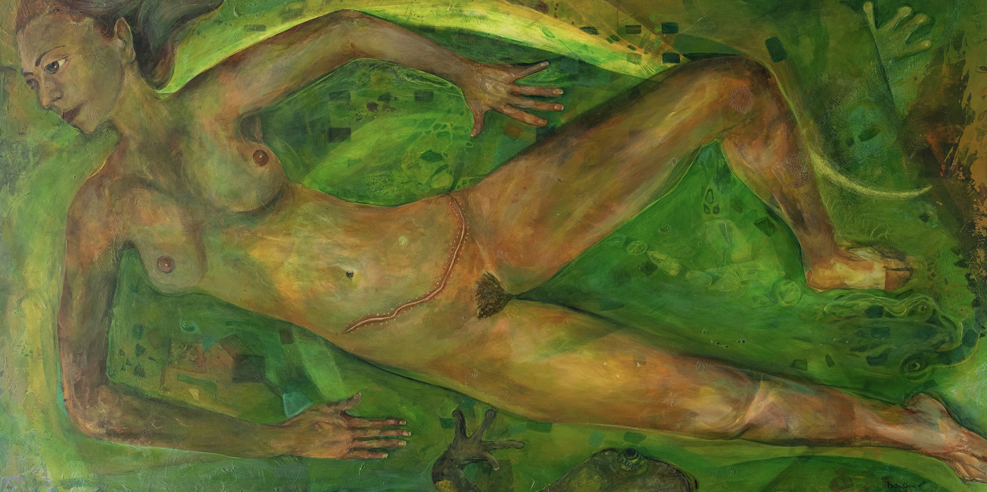 Además de la transgresión constante que es correr o fugarse, quisiera destacar la liminalidad de la costa y los flancos del pozo donde se produce el intercambio de miradas que quiebra el concepto mismo del límite y lo desborda. Lo que se produce en sus aguas es una metamorfosis. La salamandra deviene mujer y la mujer deviene salamandra. Después gesta su progenie, porque es la mujer una gestora de eventos en una costa pedregosa y coralina, en un pozo donde se deposita la memoria y una costa donde se oculta un gran anfibio. El relato visual se ocupa de dramatizar dicho anfibio con variaciones cromáticas verdosas en ambas imágenes, previendo en la escala de tonalidades verdes una mímesis entre las imágenes de la fémina y la de la salamandra. En el relato visual que nos ofrece Dafne Elvira, el horizonte y las formas ovaladas son parte de la travesía en transformación, así como la humedad y el lustre del anfibio, donde el color da fe a su vez del imperio de lo táctil y de un devenir más allá de lo humano.