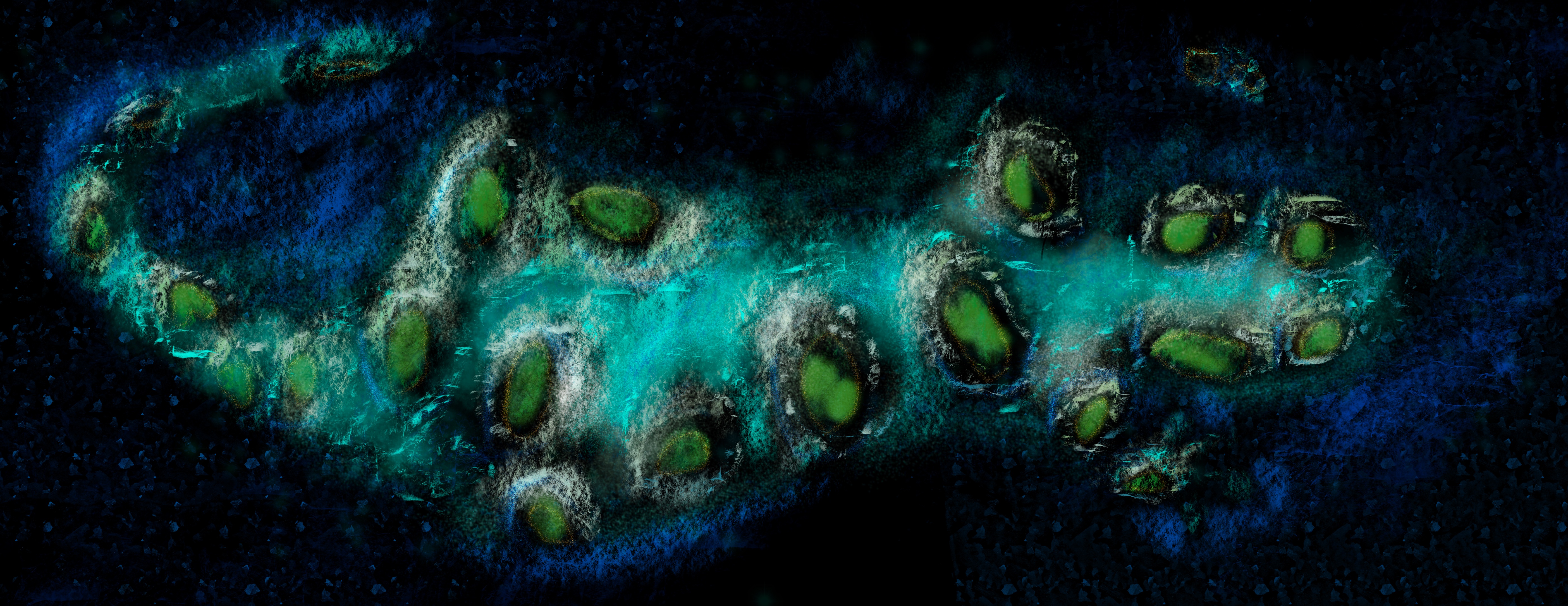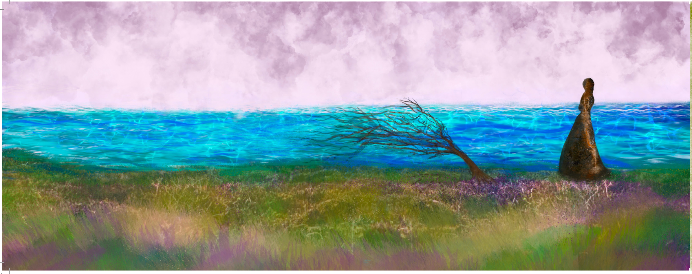 Mas ¿cuál es el evento que se anuncia en el texto, el “evento que la hará correr despavorida”? Este es un relato sobre una isla, un relato mítico-poético que atañe a un archipiélago donde visual y verbalmente predomina un paisaje marítimo poblado de verdes y azules, un espacio liminal, de borde, donde se entremezclan los colores y la mujer siempre se halla mirando un horizonte, sea dentro de un pozo o en el afuera costeño. Entre “el solsticio de la espera” y “la espuma cósmica”, todo ocurre entre umbrales o límites, en el espacio de la metamorfosis hacia otra cosa. Todo ocurre sobre la piel que se atraviesa vía la mirada. Paso a citar en el siguiente pasaje cómo se registran los cambios de ánimo de la mujer.