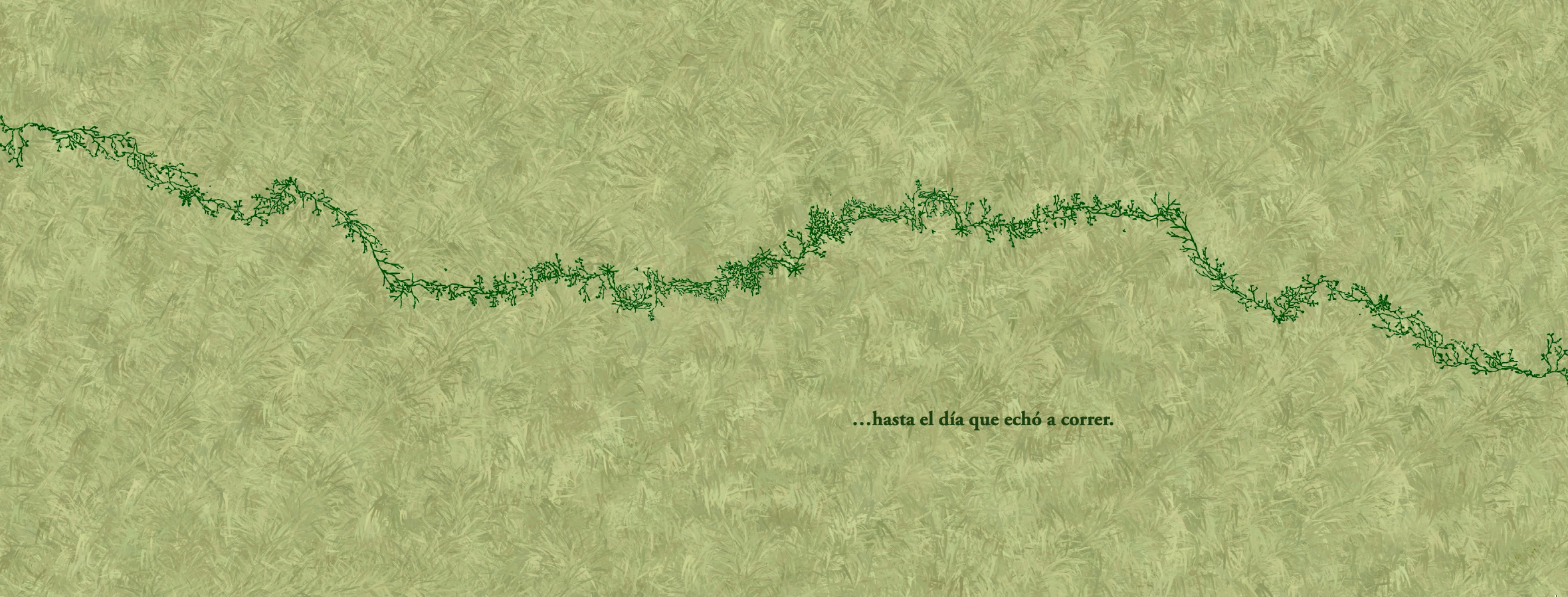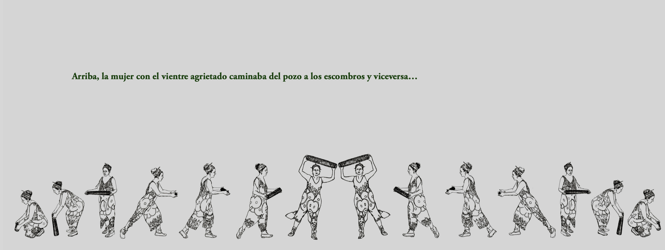 El agua, sus colores traslúcidos, muchas gamas de azul y de verde, la pureza verdosa y translúcida de la salamandra del pozo, la mujer boca arriba que parece entregarse a que la contemplen en su plenitud palpando su herida, y las muchas líneas de fuga que atraviesan el texto, a saber, la cicatriz, poblada de diminutas hojas parecidas a la marca que deja en algunos cuerpos la culebrilla, la huella de su fuga, la línea que constituye el diseño apaisado del libro y las figuras que simulan la secuencia de una mujer realizando un rito, un saludo a la luna quizá, un recorrido a lo Sísifo siempre llevando y trayendo la misma piedra, todas insisten en la linealidad y en una irrupción de sentido cuando pensamos en la cicatriz como alumbramiento.