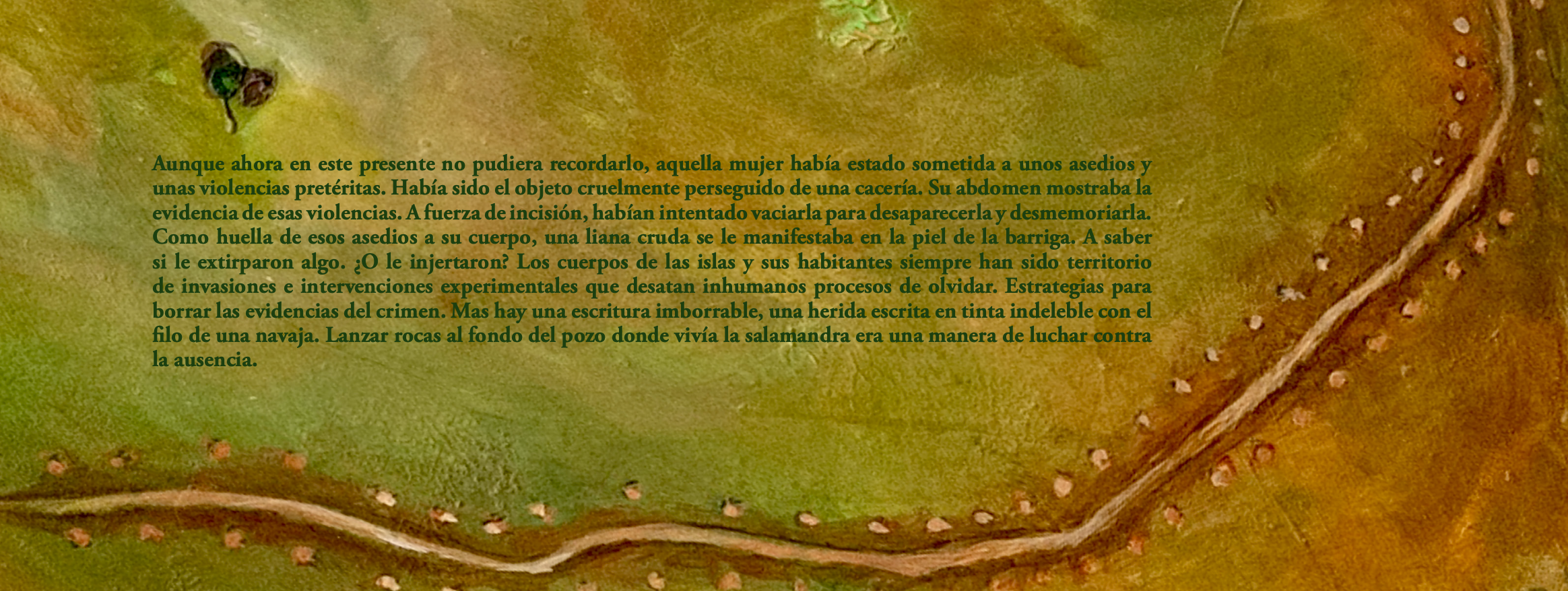 «Los cuerpos de las islas y sus habitantes siempre han sido territorio de invasiones e intervenciones experimentales que desatan inhumanos procesos de olvidar. Estrategias para borrar las evidencias del crimen. Mas hay una escritura imborrable, una herida escrita en tinta indeleble con el filo de una navaja. Lanzar rocas al fondo del pozo donde vivía la salamandra era una manera de luchar contra la ausencia.» (La isla de las salamandras)